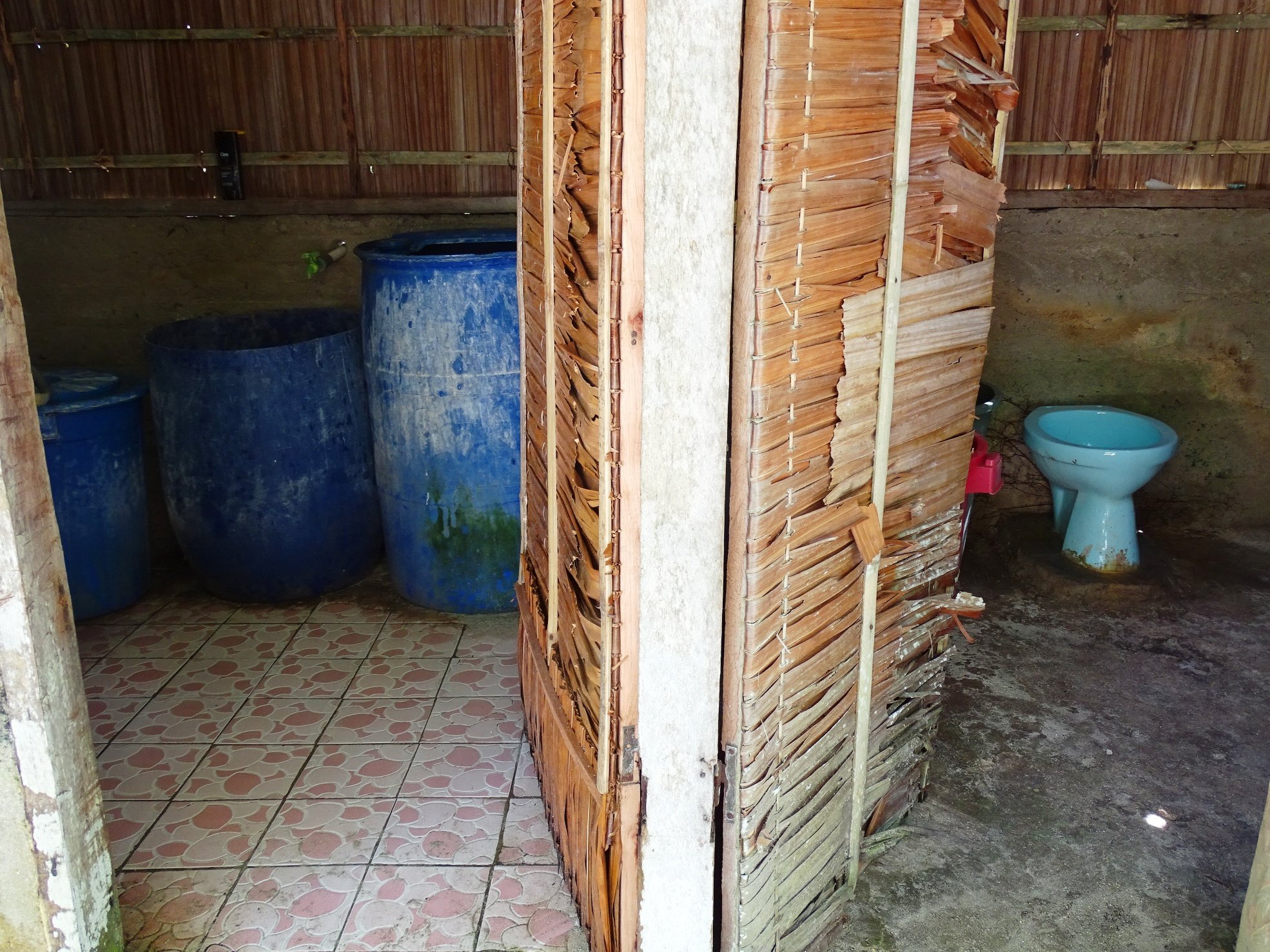 All guests share Mawar’s two room, concrete floored bathroom building. Both rooms have bucket bathing. A western style toilet is in one, and a raised squat toilet in the other.