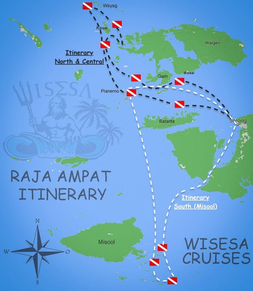 We will explore the Dampier straight, and also Pianemo, Arborek, Aljui & Fam islands, until the Gem Wayag for central North, we can also go deep south & explore the amazing Misool, our crew will choose the route at the last moment regarding weather and visibility conditions to ensure that you get an unforgettable experience on board WISESA.